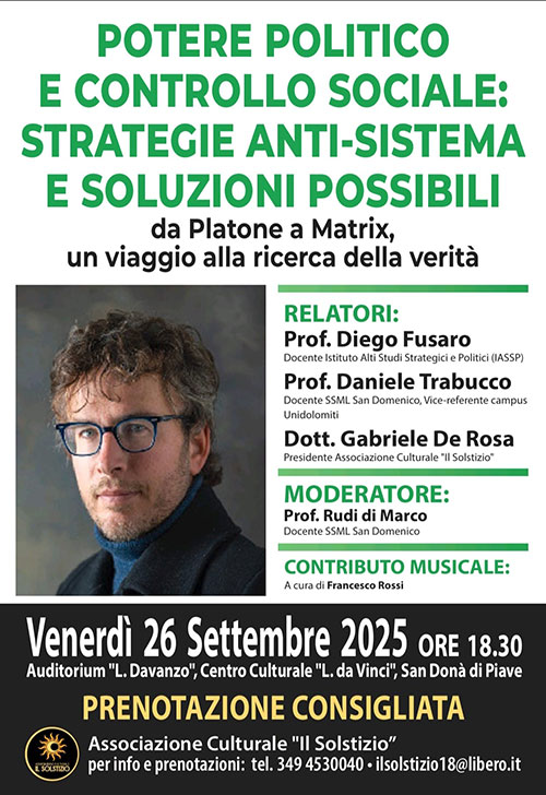 Un viaggio che unisce filosofia e attualità, da Platone a Matrix, per riflettere sul rapporto tra potere politico e controllo sociale. È questo il tema dell’incontro che si terrà venerdì 26 settembre 2025 alle ore 18.30 presso l’Auditorium “L. Davanzo” del Centro Culturale “L. da Vinci” a San Donà di Piave.