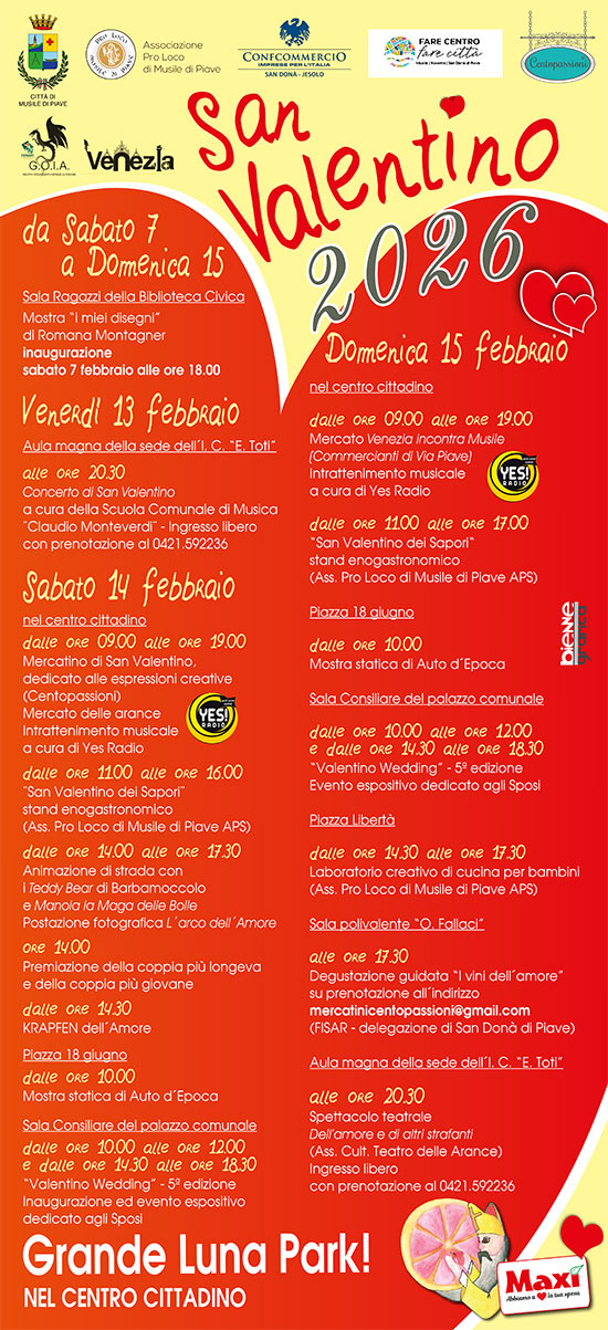Domenica 15 febbraio il centro cittadino ospiterà, dalle 9.00 alle 19.00, il Mercato di Venezia incontra Musile, con intrattenimento musicale e numerose bancarelle. Dalle 11.00 alle 17.00 sarà attivo lo stand enogastronomico della Pro Loco. In piazza XVIII Giugno tornerà la mostra di auto d’epoca, mentre nella sala consiliare proseguirà l’evento espositivo dedicato agli sposi. In piazza Libertà, dalle 14.30 alle 19.00, laboratorio di cucina per bambini e alle 17.30 degustazione guidata “I vini dell’Amore” a cura della Fisar delegazione di San Donà di Piave. Alle 20.30, nell’aula magna della “Toti”, spettacolo teatrale “Dell’amore e di altri strafanti” dell’associazione culturale Teatro delle Arance (ingresso libero su prenotazione).