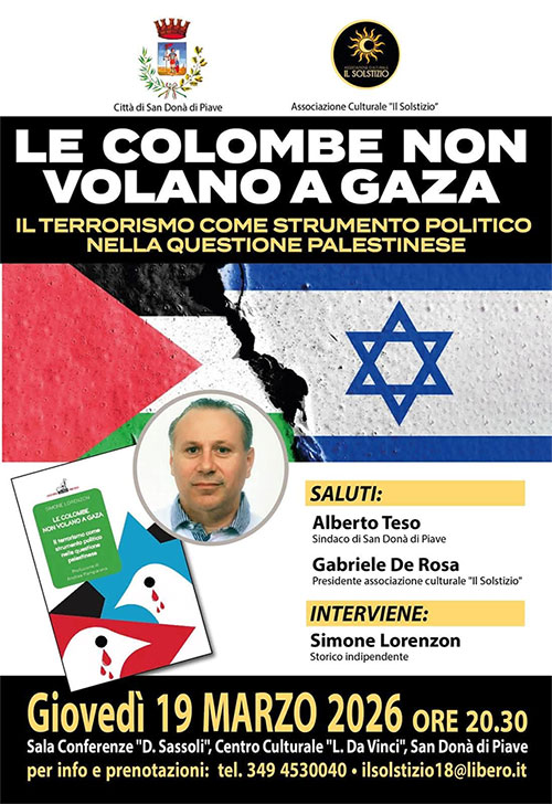 Un incontro di approfondimento dedicato a una delle questioni geopolitiche più discusse e controverse degli ultimi anni. L’Associazione Culturale Il Solstizio, con il patrocinio della Città di San Donà di Piave, organizza la serata “Le colombe non volano a Gaza – Il terrorismo come strumento politico nella questione palestinese”, in programma giovedì 19 marzo 2026 alle ore 20.30 nella Sala Conferenze “D. Sassoli” del Centro Culturale “L. Da Vinci” a San Donà di Piave.