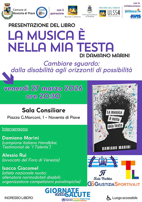 Venerdì 27 marzo 2026, alle ore 20.30, presso la Sala Consiliare del Municipio di Noventa di Piave, si terrà la presentazione del libro “La musica è nella mia testa” di Damiano Marini, iniziativa promossa dall’Amministrazione comunale all’interno della rassegna “Giornate della Salute”, dedicata ai temi della disabilità e dell’inclusione.